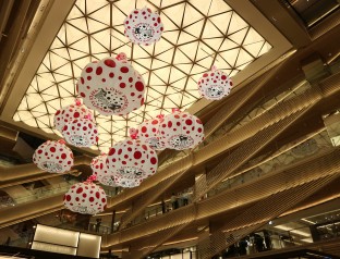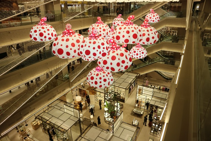 On the site of Matsuzakaya in Ginza 6 Chome, the complex facility,”GINZA SIX” opened as a largest scale facility in April 20, 2017! The “Life At It Best” is the concept of this shopping mall. The Logo with a strong vision has an impact, with the simple exterior that appearance incorporating “Wa” , and it is also attracting attention to the interior packed with commitment! On the second floor, in the center large open ceiling of the atrium, they exhibit one of the world avant-garde artist, Yayoi Kusama work (Limited exhibition: April 20, 2017(Thurs)~Feb 25, 2018(Sun)) of cute pumpkin balloons with red dots with white background. The exhibition, the works of various artists that change every year are also noted!